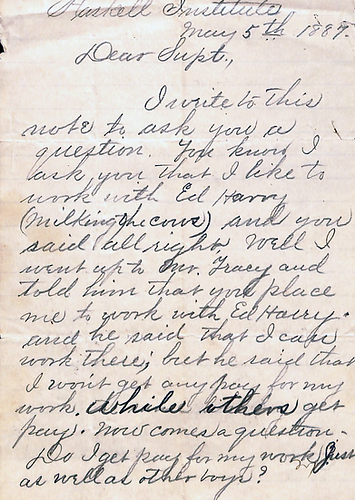 I write to this note to ask you a question. You know I ask you that I like to work with Ed Harry (milking the cows) and you said all right. Well I went up to Mr. Tracy and told him that you place me to work with Ed Harry and he said that I can work there; but said that I won't get any pay for my work. while them get pay. Now comes a question-Do I get pay for my work just as well as other boys?Mr. Supt., I am well satisfy with this kind of work which I am now engage to do, and think am old enough to bear the work just as best as I can in every way, and but I could not get along well without earning a small amount of money.